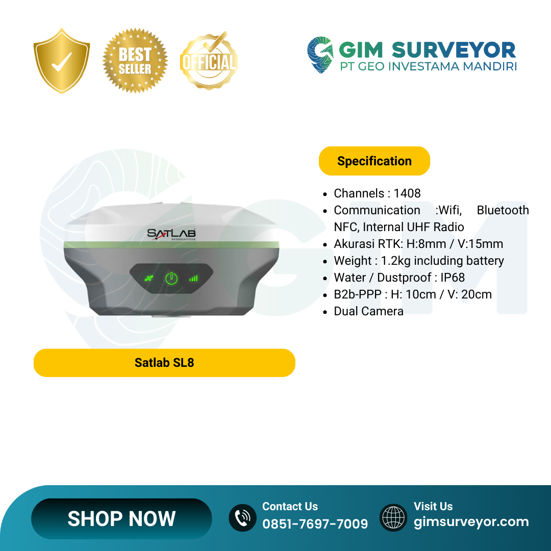 Satlab SL8 adalah receiver GNSS RTK generasi terbaru yang menggabungkan teknologi laser measurement, dual camera, IMU, dan GNSS multi-konstelasi untuk meningkatkan efisiensi pekerjaan survei dan pemetaan. Perangkat ini dirancang untuk memberikan pengukuran yang cepat, akurat, dan fleksibel bahkan pada kondisi lapangan yang kompleks atau area dengan keterbatasan sinyal GNSS.